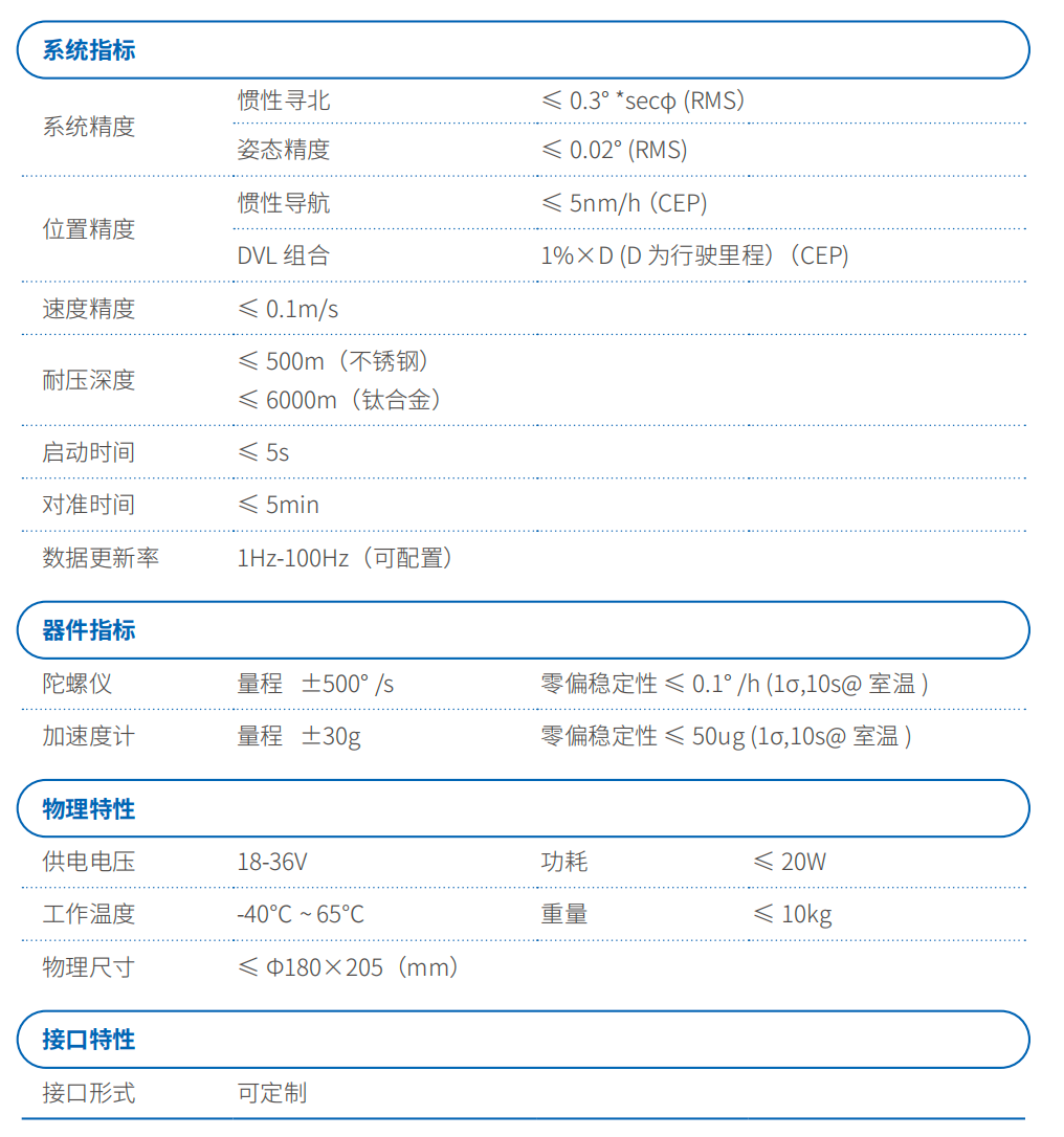產品搭載全新的導航融合算法,提供慣導 +DVL 緊密耦合解決方案,結合了公司最新的導航技術,提供可擴展的各種組合方案,其性能和特性可為各種水下設備提供高精度導航信息。